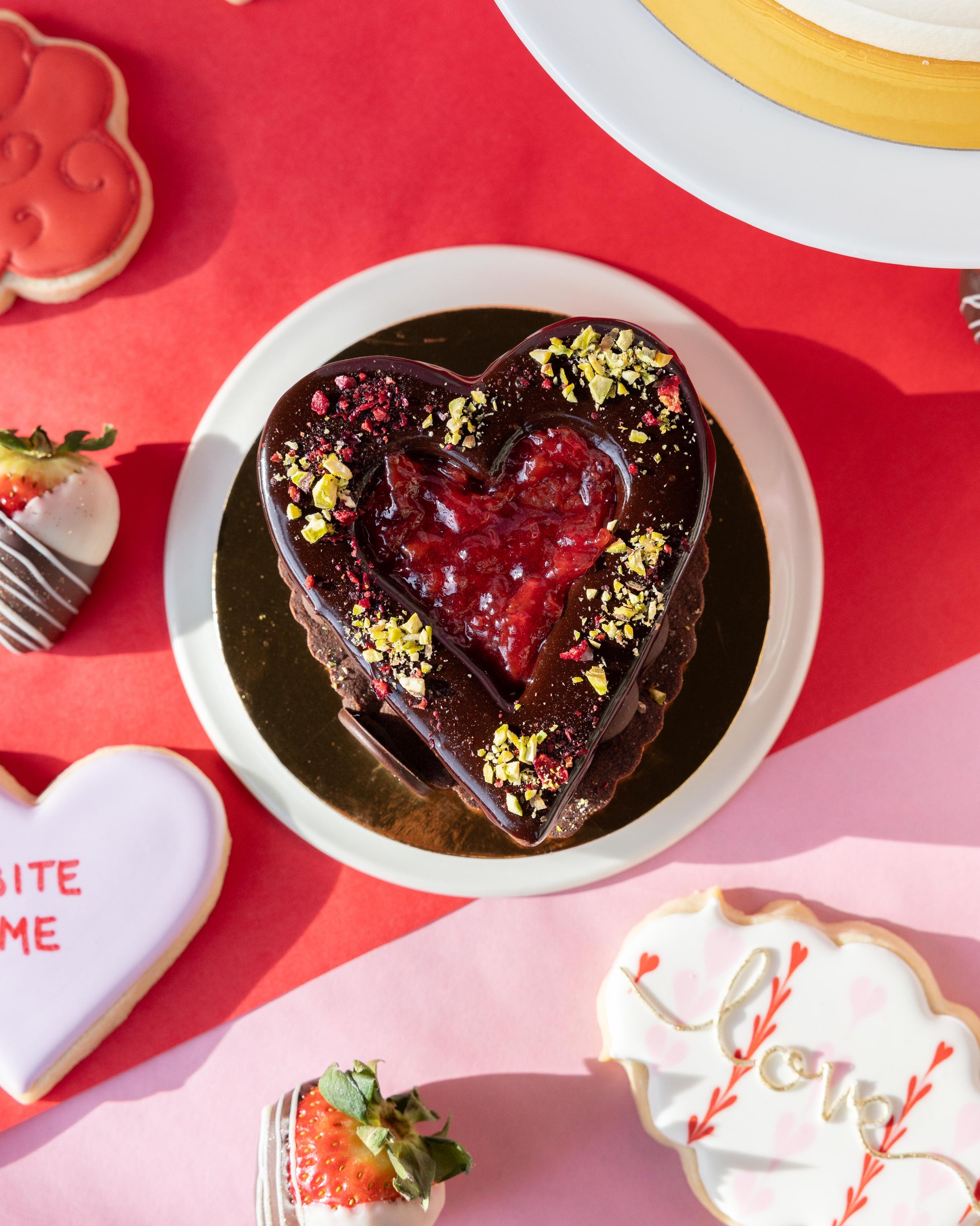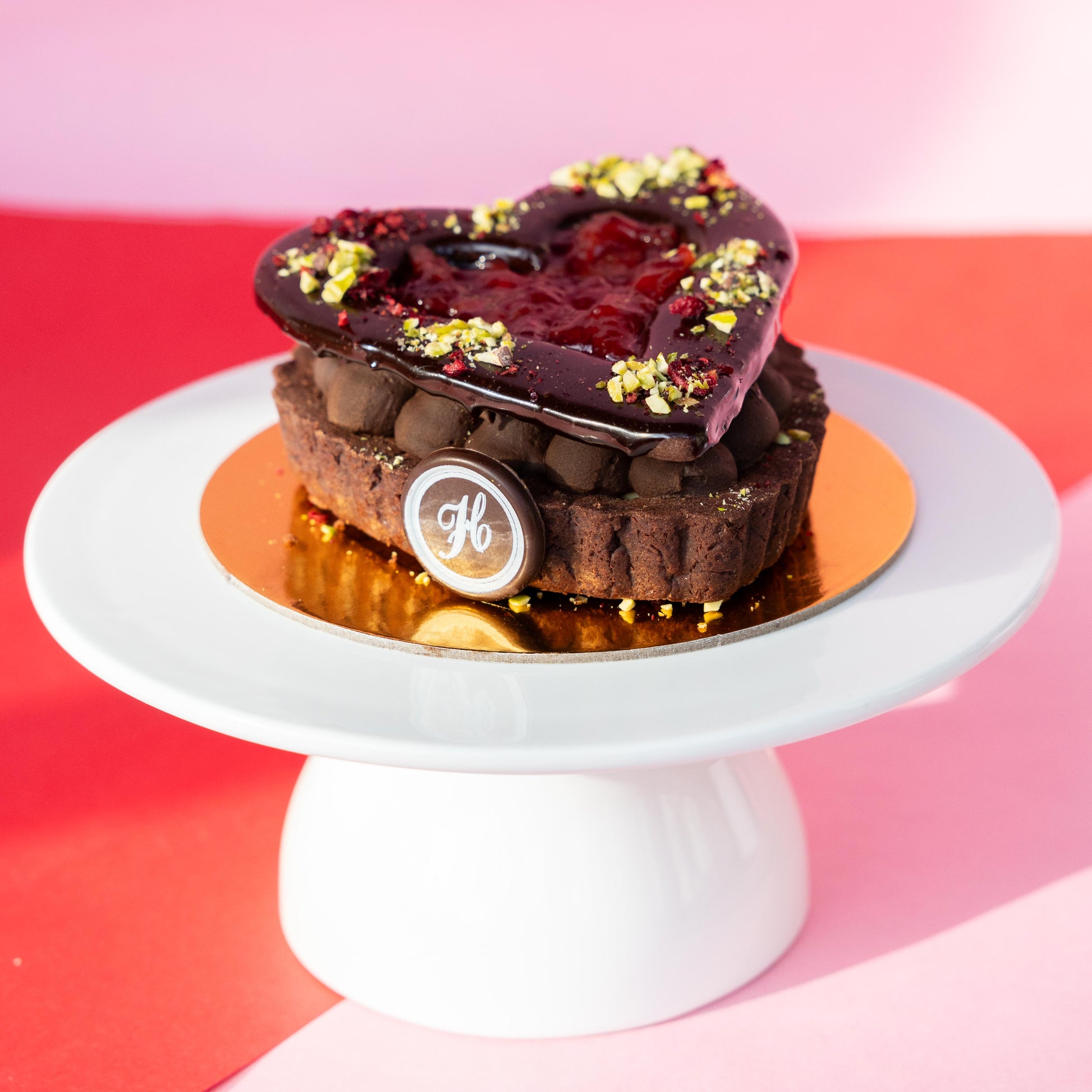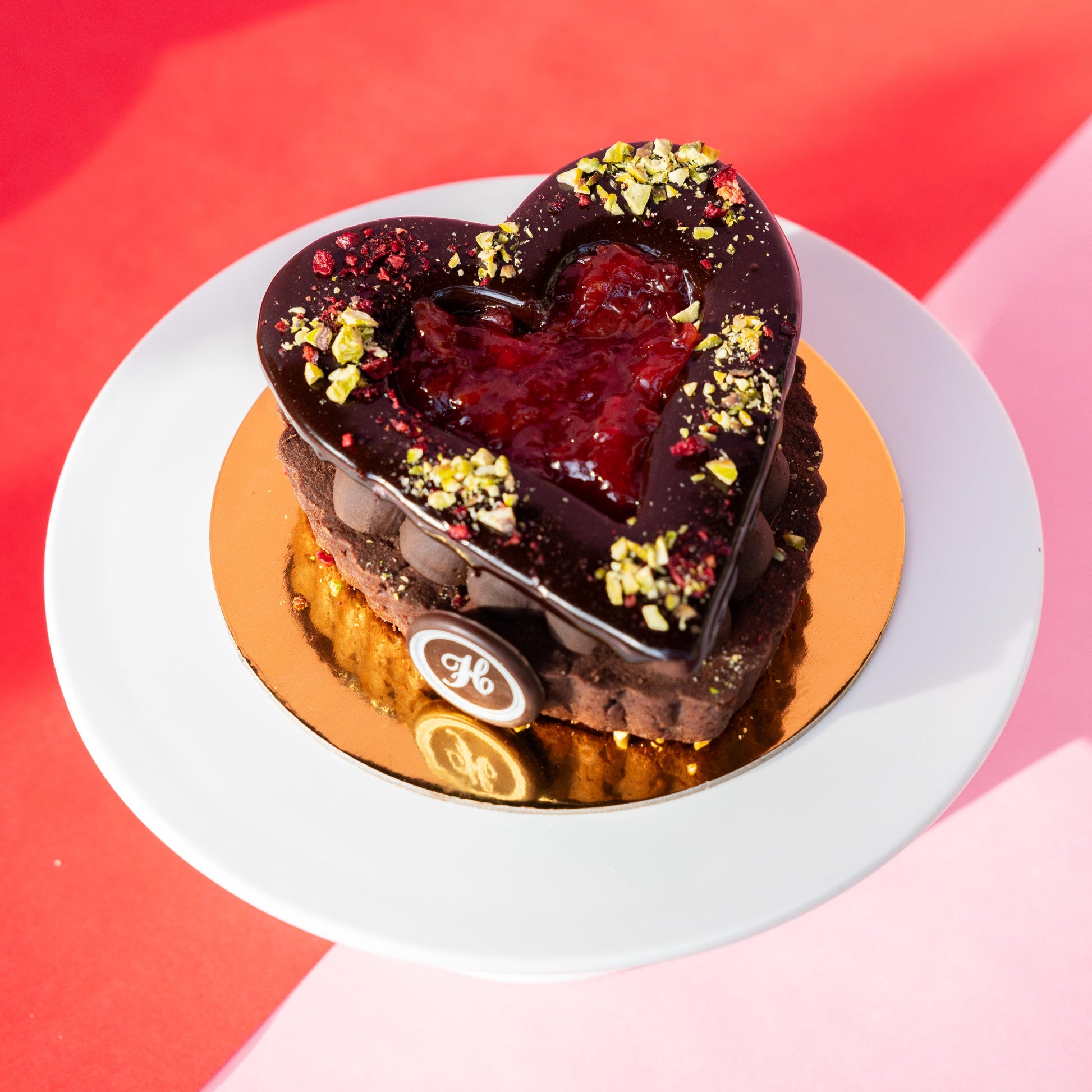 A heart-shaped chocolate tart shell filled with pistachio white chocolate ganache, dark chocolate ganache, and tart cherry jam, finished with a dark mirror glaze, dried cherry, and roasted pistachios.