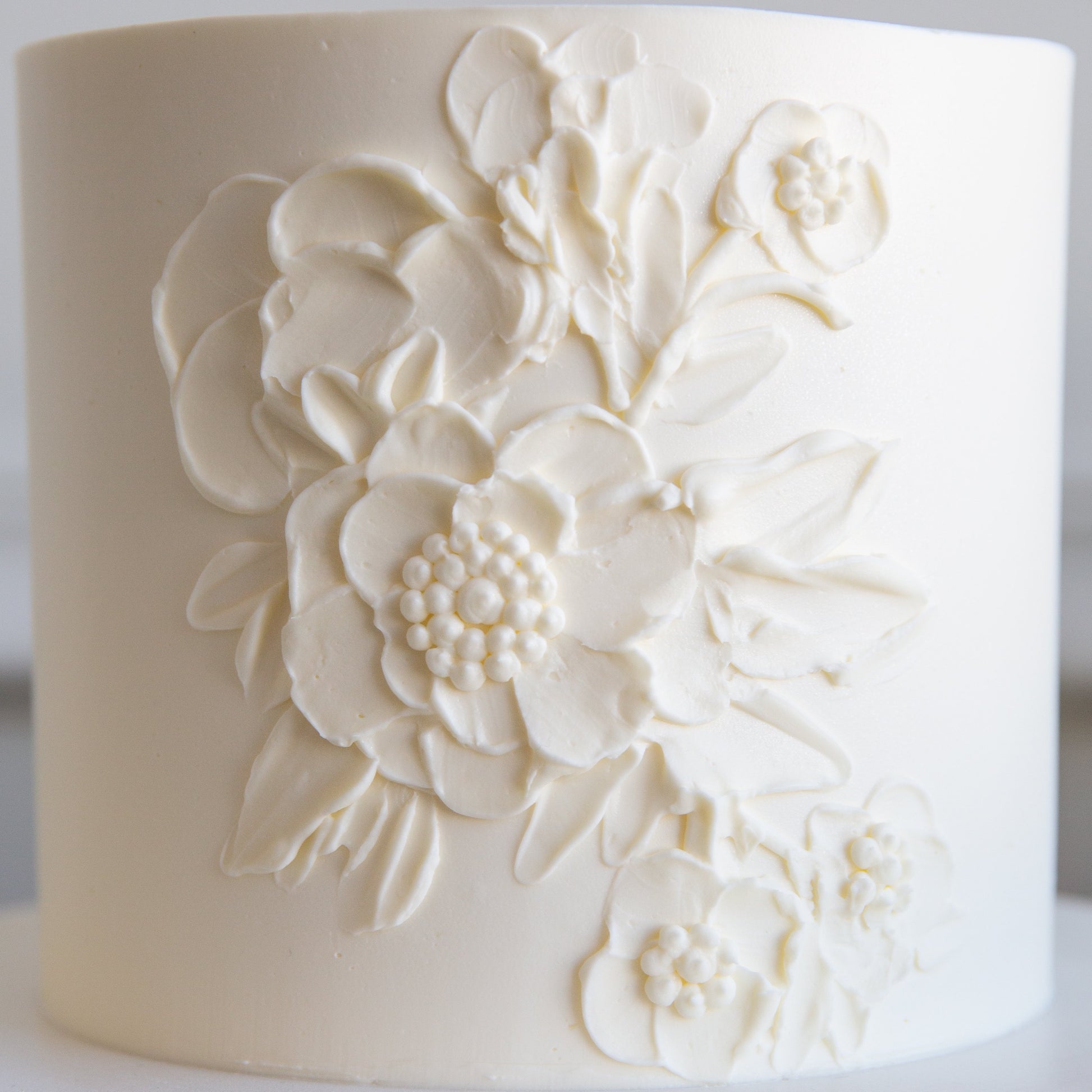Made using a buttercream palette knife technique to create a floral design in ivory. No alteration on the color of the floral design.
