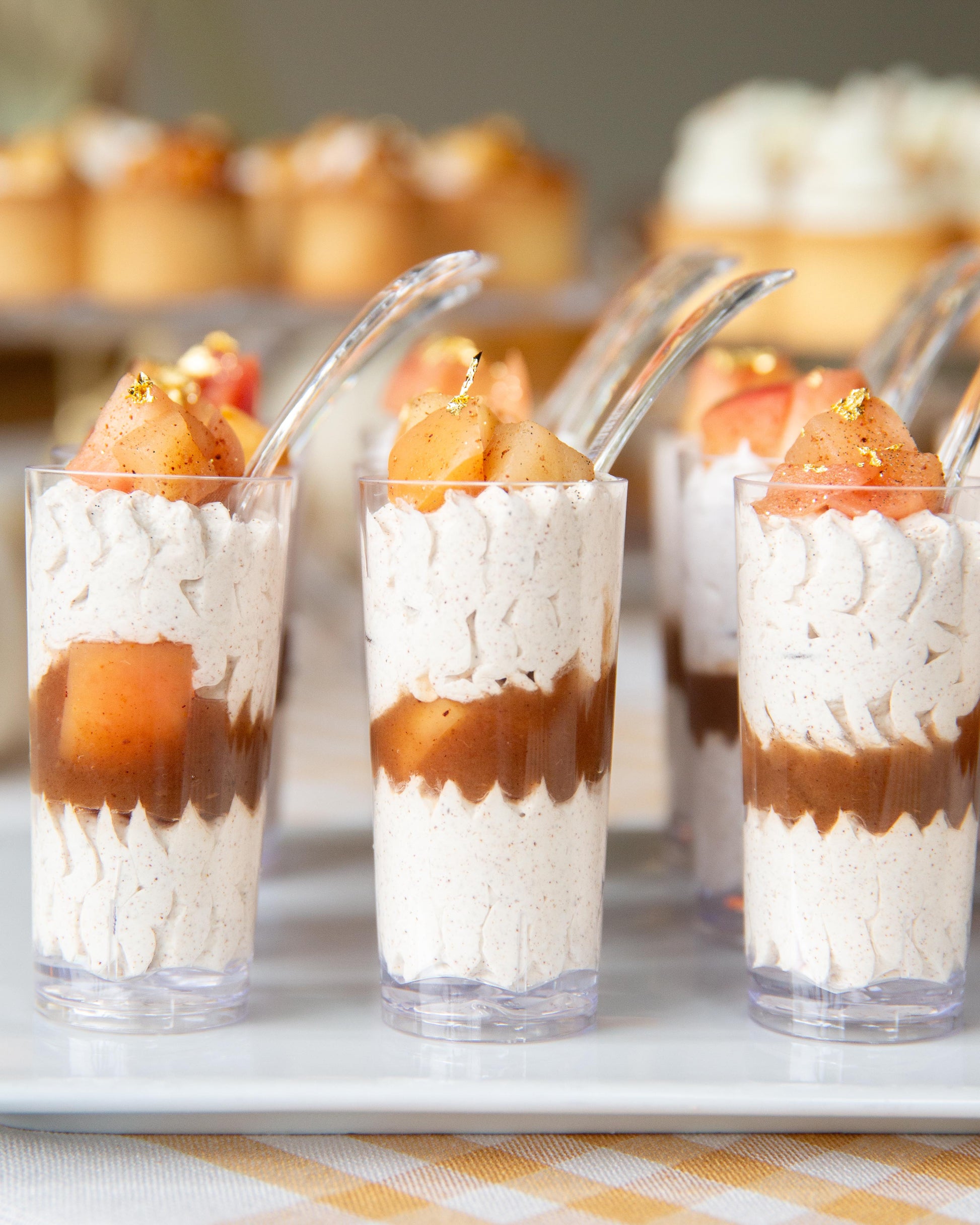 A dozen 3" tall clear cups filled with layers of creamy cinnamon vegan mousse (contains coconut), apple butter, and spiced sautéed apples. Comes with a clear spoon inserted into each cup.